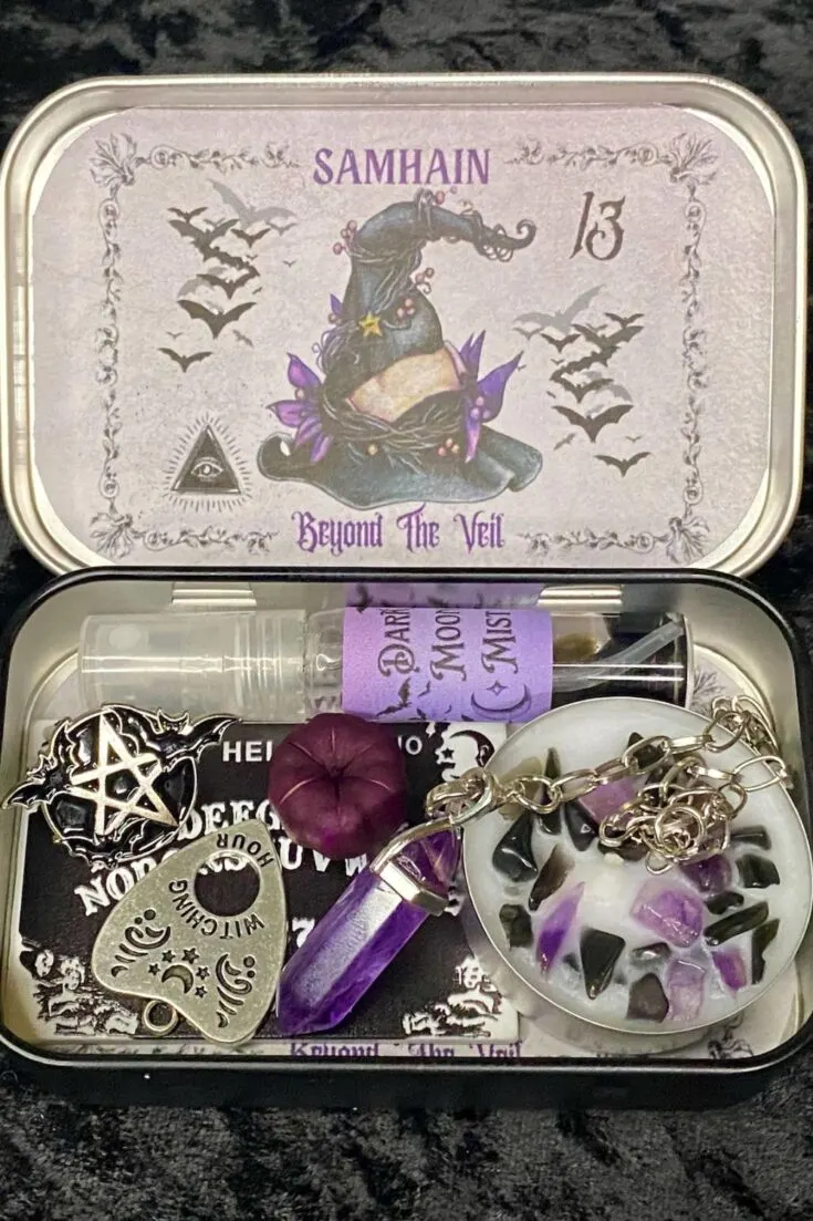 A portable altar kit packed with divination tools and protection items. Includes an amethyst pendulum, spirit board, moon mist spray, candles, and charms. A powerful, compact addition to any Samhain altar.