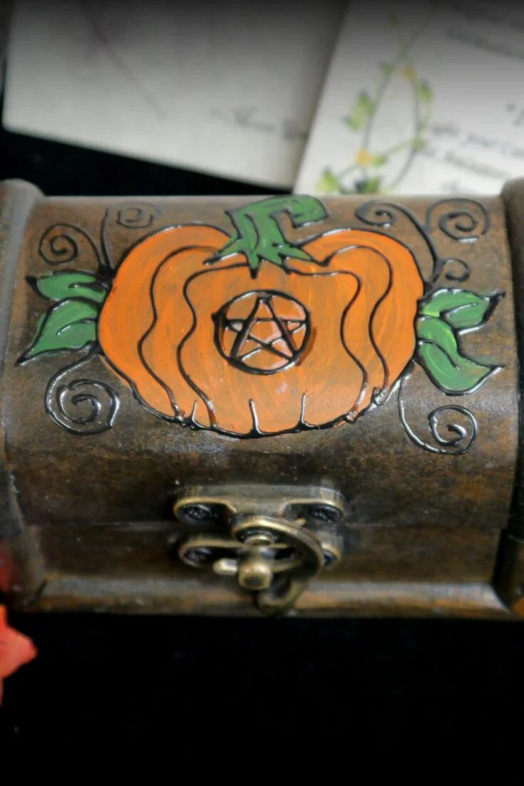 Hand-painted wooden chest with a pumpkin and pentacle design. Perfect for storing crystals, herbs, or incense on your altar.