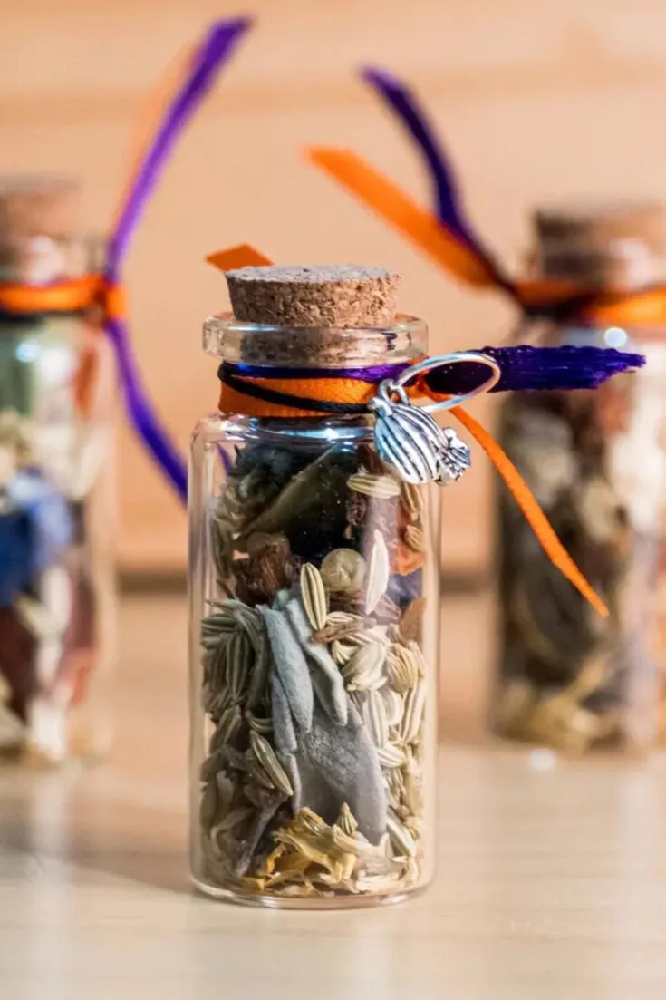 Glass vial filled with herbs, crystals, and resins for protection. A simple yet powerful addition to any Samhain altar.