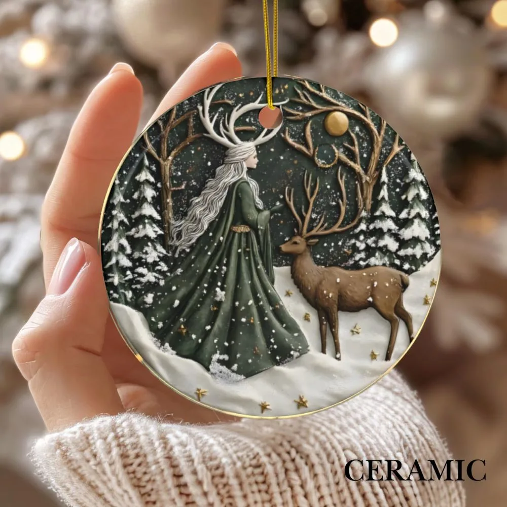 A beautiful ceramic ornament featuring a Yule witch in earthy greens, celebrating pagan traditions and the Winter Solstice. Perfect for witchy Christmas decor or as a thoughtful Yule gift for any Wiccan or nature lover.