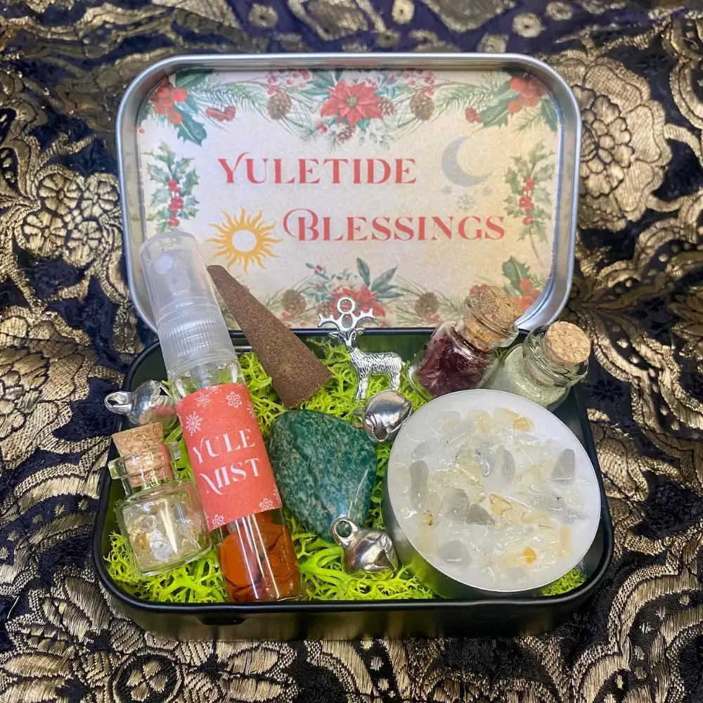A portable Yule altar filled with crystals, herbs, incense, and a Winter Solstice spell. This beautifully curated pagan gift celebrates renewal, light, and the magic of Yule—perfect for any witch’s altar or travel kit.
