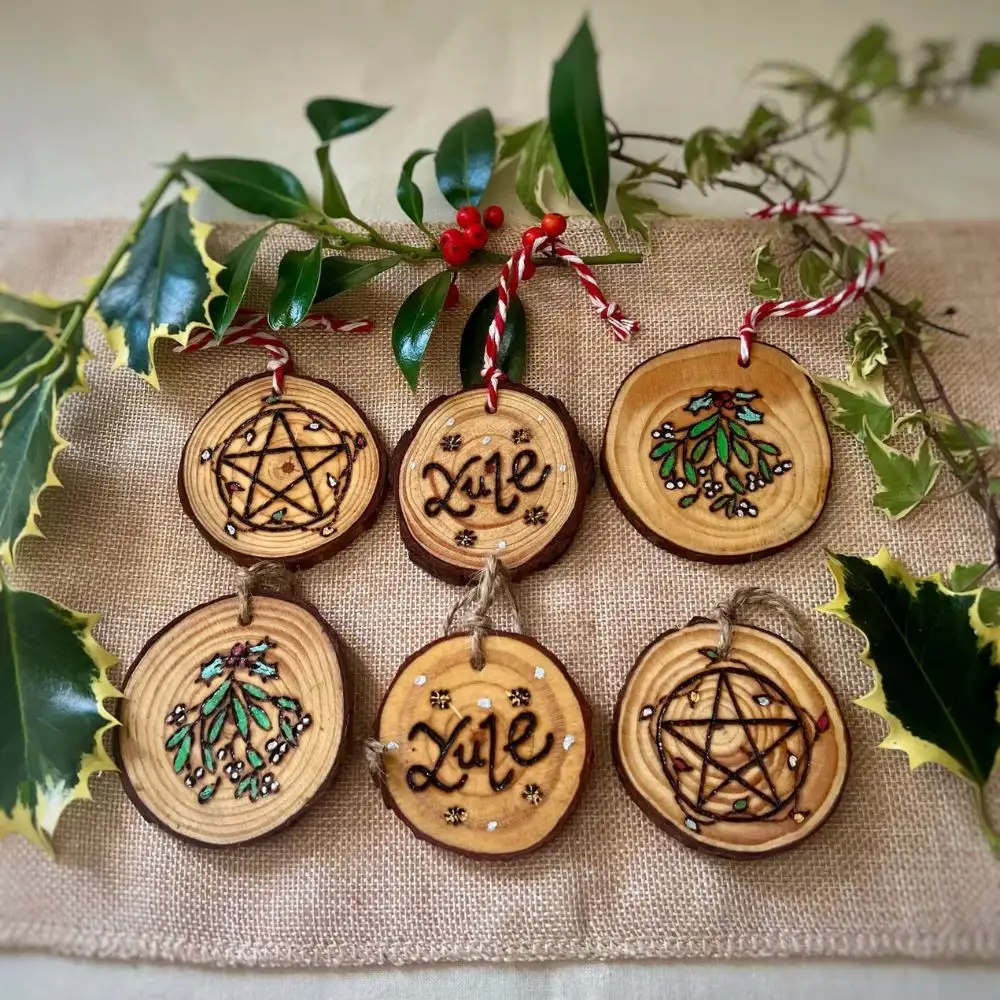 Hand-painted and pyrographed wooden ornaments featuring holly, mistletoe, and pentagram designs. Perfect for pagan Yule decorations or adding rustic Winter Solstice charm to your altar or tree.