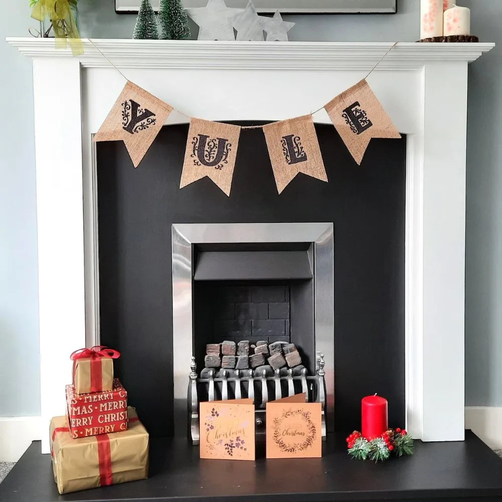 A rustic hessian bunting spelling out “Yule” in black glitter vinyl. Perfect for pagan Yule decorations, this handmade Wiccan garland adds a warm Winter Solstice touch to your altar, mantle, or festive display.
